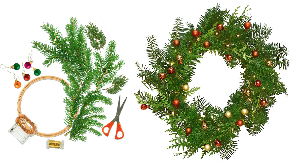 Étape 1. Coupe des petites branches de sapin et de thuya. Fixe-les par la base de leur tige sur le cercle à l’aide du fil métallique.
