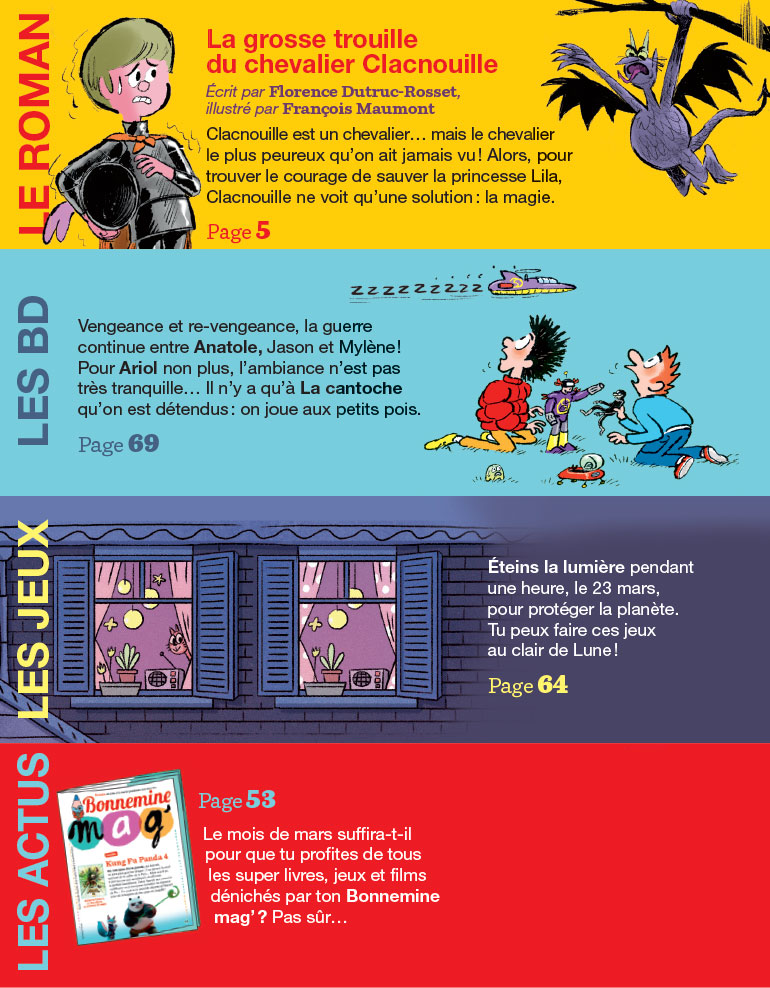 - Le roman : “La grosse trouille du chevalier Clacnouille”, écrit par Florence Dutruc-Rosset et illustré par François Maumont.